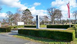 Großes Gräberfeld mit verstreuten Gedenksteinen, im Eingangsbereich eine quadratische Säule, Gedenktafeln und ein Fahnenmast mit der österreichischen Fahne.