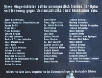 Diese Hingerichteten sollen unvergesslich bleiben. Ihr Opfer soll Mahnung gegen Unmenschlichkeit und Faschismus sein. (Namen) Initiiert von Käthe Sasso. Umgesetzt von den Steinmetzlehrlingen der Berufsschule Schrems.