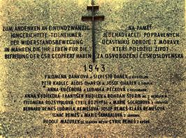 ZUM ANDENKEN AN EINUNDZWANZIG HINGERICHTETE TEILNEHMER DER WIDERSTANDSBEWEGUNG IN MÄHREN DIE IHR LEBEN FÜR DIE BEFREIUNG DER CSR GEOPFERT HABEN.