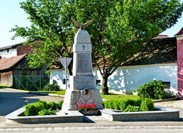 Rechteckige, mehrfach unterteilte Säule auf Pyramidenstumpf gekrönt mit Adler am Dorfplatz.