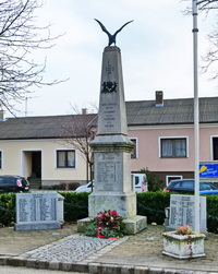 Stele gekrönt mit Adler flankiert von zwei Gedenktafeln am Hauptplatz.