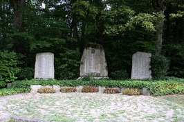 Im Friedhof: drei aufrechte Steine mit eingearbeiteten Namenstafeln