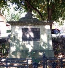 Mit Metallzaun umgebenes Steinmonument, das von einem aufliegenden Stahlhelm abgeschlossen wird. An der Vorderseite eine rechteckige Metalltafel mit den Namen der Gefallenen und umlaufender Widmung.
