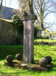 Vor der Kirche an der Hauptstraße steht ein stelenförmiges Denkmal. Oben auf ruht ein steinerner Löwe.