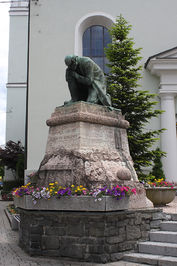 Vor der Kirche; Denkmal oben mit knieendem Soldaten, Inschrift vorne