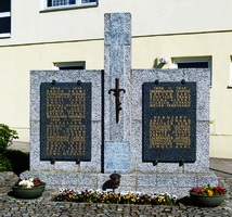Stele in Form eines Kreuzes flankiert von Namenstafeln am Dorfplatz.