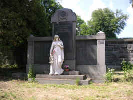 stand. Mittig steht eine weibliche Figur mit Kranz, seitlich zwei Namenstafeln