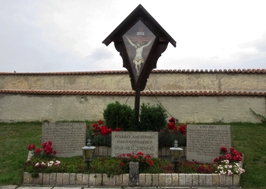 Gedenksteine auf dem Friedhof zu beiden Seiten eines Marterls.