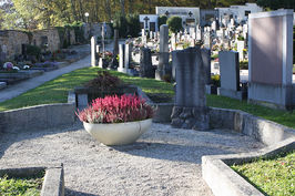 Amstetten (1. Weltkrieg), Bezirk Amstetten, Niederösterreich, ÖsterreichPLZ 3300 Im alten Friedhof: ein achteckiger, bekiester Platz mit einem Zugangsweg. In der Mitte Blumenschale, seitlich der Gedenkstein.