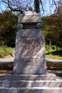 Steinstele auf einem dreistufigen Steinsockel, das Dach mit einem kleinen Kreuz wird von vier Steinkugeln gestützt Auf drei Seiten beschriftete Steintafeln, die vierte Seite unbeschriftet