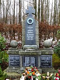 Steinaltar mit Aufsatz. Oben ein Deutsches Kreuz. Im Sockel sind drei Gedenktafeln eingefügt, oben eine