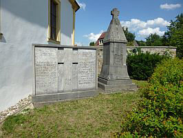 Bei der Kirche befinden sich die Kriegerdenkmäler. 1. Weltkrieg: Eine viereckige Steinstele, oben zulaufend mit einem Kreuz als Abschluß. 2. Weltkrieg: Daneben ein Gedenkstein mit einem Steinkreuz in der Mitte.