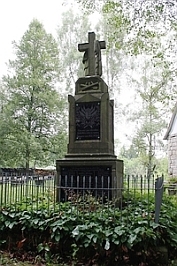 Bei der Lorettokapelle; gemauerte Säule, oben mit Kreuz, vorne Gedenktafeln