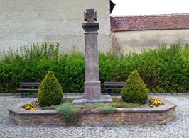 Denkmal auf dem Friedhof: eine schlanke Steinsäule, gekrönt vom Tatzenkreuz.