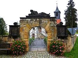 Über dem Eingangstor zum Friedhof liegt eine Figur eines sterbenden Soldaten. Links und rechts des Tores sind Namenstafeln angebracht.