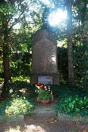 Auf dem Friedhof steht ein ca. zwei Meter hoher Stein aus rotem polierten Granit