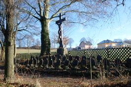 Auf dem Friedhof steht ein großes Kreuz . Davor in zwei Reihen kleine Holzkreuze mit je einer Namensplatte für die Gefallenen des 1. Weltkrieges aus Börnichen