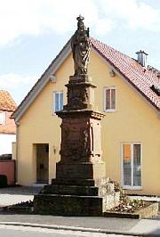 Verzierte viereckige Sandsteinsäule mit Marienstatue. (1870) Die Säule ist mit zahlreichen Verzierungen versehen. Gedenkstein aus Sandstein mit einer Skulptur eines sterbenden Soldaten. Vorne ein aus dem Stein herausgearbeiter Lorbeerkranz mit eisernem Kreuz, einem Helm, Tornister, Fahne und Gewehr. An der Wand dahinter sind zwei Namensplatten aus Stein eingefügt.