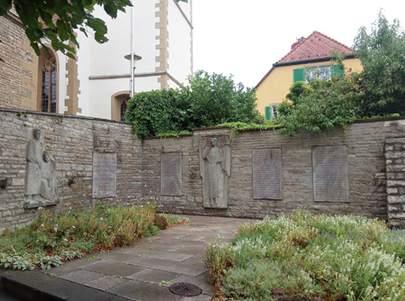 Einzelgedenken von Grabsteinen im nahen Friedhof (60 m).