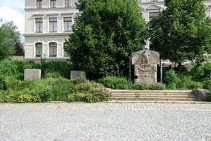 Im Zentrum vor der Schule steht das Denkmal (bzw. Teile davon). Mittig steht ein Widmungsstein mit großem Adler, welcher – in mehrere Teile zerbrochen – wieder zusammengepuzzelt wurde. Links davon stehen zwei Namenssteine (Gefallene von 1914-1917). Die weiteren Namen fehlen (bzw. brechen ab Datum 17.4.17 ab), denn rechts vom Adler steht nur noch ein Gedenkstein für einen erschossenen Kommunisten.