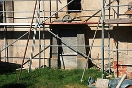 An der Wand der fast völlig zusammengefallenen Ruine der Kirche –neben dem Friedhof- befindet sich eine Namensplatte in Stein eingefasst