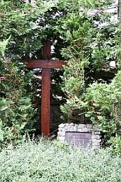 Im Friedhof; Holzkreuz und daneben Stein mit Tafel