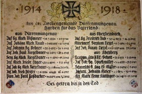 1914 1918 Aus der Kirchengemeinde Dürrenmungenau starben für das Vaterland: (Namen) Sei getreu bis in den Tod