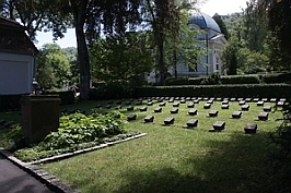 Im Friedhof des Stadtteils Ebingen; russ. Kriegsgräber, mehrere Reihen mit schräg angestellten Steinen am Boden, in der Mitte ein Quader mit Rundumschrift in kyrillisch