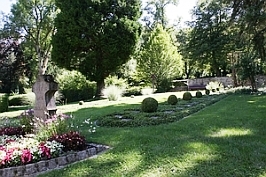 Im Friedhof des Stadtteils Ebingen; a) am Platz oberhalb der alten Aussegnungshalle Soldatengräber, vorne Steinkreuz und dahinter Steinplatten am Boden; b) am Platz links unterhalb der alten Aussegnungshalle Kriegsgräber, schräg angestellte Steinplatten in U-Form, in der Mitte Blumenarrangement