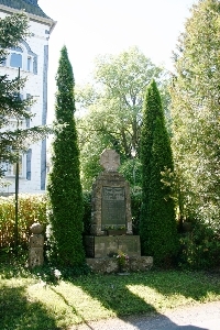 Denkmal für die Gefallenen des 1. Weltkriegs auf einem gestuften Sockel; dieser mit einer Tafel mit den Namen der Opfer des 2. Weltkriegs.