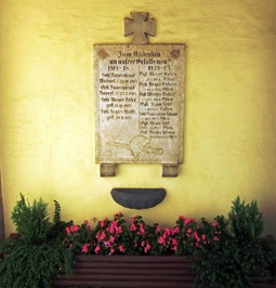 Gegenüber des Kircheneingangs, im Durchgang zum Friedhof, sind die Kriegsopfer auf einer Steintafel verzeichnet.