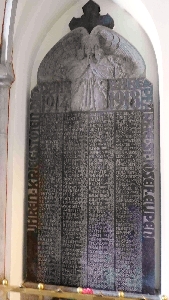 Gedenktafeln aus Stein für die Gefallenen des 1. Weltkriegs mit einem krönenden betenden Engel in der St. Josef Kirche