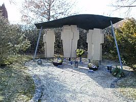 Auf dem Friedhof sind drei Gruppen von zwei bzw. drei übereinander liegenden Holzkreuzen aufgestellt. Die Gruppen sind überdacht.