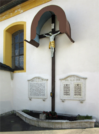 Gedenktafeln zu beiden Seiten eines Kruzifixes an der Kirche. Ergänzende Angaben von Einzelgedenken auf Privatgräbern.