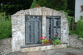 Vor dem Friedhofs-/Kirchhofseingang steht ein aus Feldstein gemauertes Denkmal mit zwei Namensplatten
