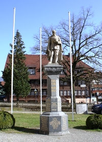 Bei der Kirche eine achteckige Säule, oben mit stehendem Soldaten. Inschriften und Namen am achteckigen Teil; zusätzlich Hinweise zu Soldaten von privaten Gedenksteinen