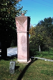An der Görziger Straße steht eine schmale, zwei Meter hohe Stele aus rotem Stein.
