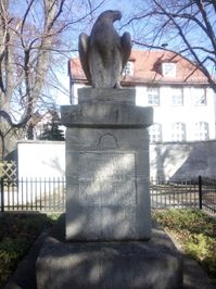 Denkmal mit einem Adler. Es trägt auf allen vier Seiten Inschriften. Links und rechts des Denkmals