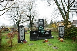 Das dreiteiliges Denkmal für die Opfer des 2.Weltkrieg steht auf dem Friedhof. Das Mittelteil besteht