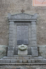 Außen an der Kirche: steinernes Tor, darin Gedenktafel. Darunter auf einem Sockel Stahlhelm und Lorbeerkranz. Am Sockel nicht mehr lesbare Inschrift.