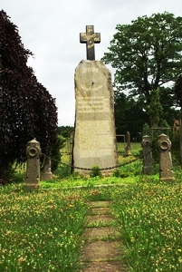 Vor der Kirche steht das 2017 renovierte Gefallenendenkmal. Es ist ein ca 2,5 m hoher Stein; obenauf steht ein Kreuz aus dunklem Granit. In dem Stein sind in Goldschrift Widmung und Gefallenennamen eingehauen. Ebenfalls neben der Kirche befindet sich ein Einzelgrab.