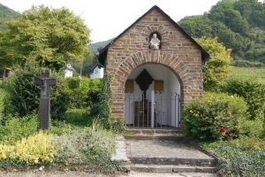 Kleine Kapelle mit offenem Rundbogen und schmiedeeisernem Gitter. Darüber in einer Nische eine Halbfigur, die mit ihren Händen einen Hirschkopf am Geweih hält. Innen auf einem gemauerten Altar ein bedachtes Holzkreuz; links und rechts daneben Bronzetafeln mit den Namen. Links neben der Kapelle ein Steinkreuz aus dem Jahr 1671.
