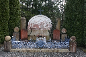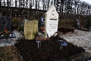 Im Friedhof ein Gedenkstein mit rundem Abschluss und Bildrelief, flankierte von zwei runden Säulen, davor zwei Sandsteintafeln mit Namen; zusätzlich Hinweise zu Soldaten von privaten Gedenksteinen; ferner ein Grab mit zwei Steinen und einer Platte am Boden für erschossene Deutsche und Polen.