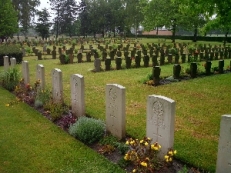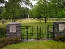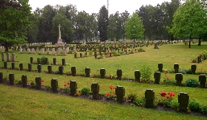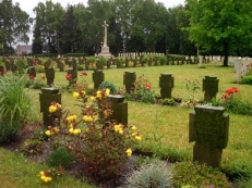Britische Kriegsgräberstätte mit deutschen Gräbern für Gefallene des 1. Weltkriegs, Steinkreuz-Grabreihen hufeisenförmig angelegt, im vorderen Teil die deutschen Gräber (mit einem prächtig verzierten Grabstein für Oblt. von Negelein und Ltn. Burgatzcky), im hinteren Teil um das Hochkreuz die britischen Gräber.