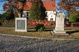 Vor der Kirche an der Außenseite der Friedhofsmauer steht ein heller Granitobelisk (1. Weltkrieg) und