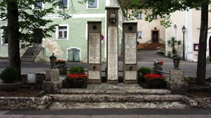 Steintafeln auf drei Stelen in der Ortsmitte, an der Straße vor der Kirche.