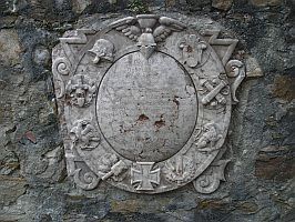 Kanonen, einer Handgranate, Löwe, Adler, Schwertern) umrahmt. - Im Eingangsbereich der
