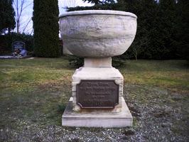 taufsteinartigem Aufbau. Am Würfel angebracht Tafel mit Inschrift.