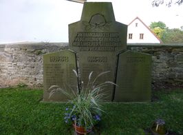 Kreuz aus Sandstein mit herausgearbeitetem Stahlhelm, sowie Eichenlaub. Daneben zwei Gedenksteine aus Sandstein.