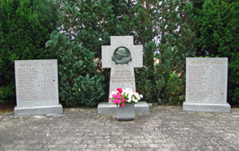 Das in der Mitte stehende Steinkreuz trägt neben der Inschrift das Profil eines Soldaten. Namen und Daten der Opfer sind auf den beiden flankierenden Steinen verzeichnet.